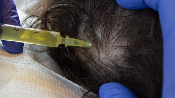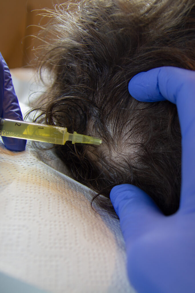 Resultatet efter tre behandlinger PRP mod uønsket hårtab. Der er desuden blevet foretaget microneedling med peptider som tillæg til behandlingen.